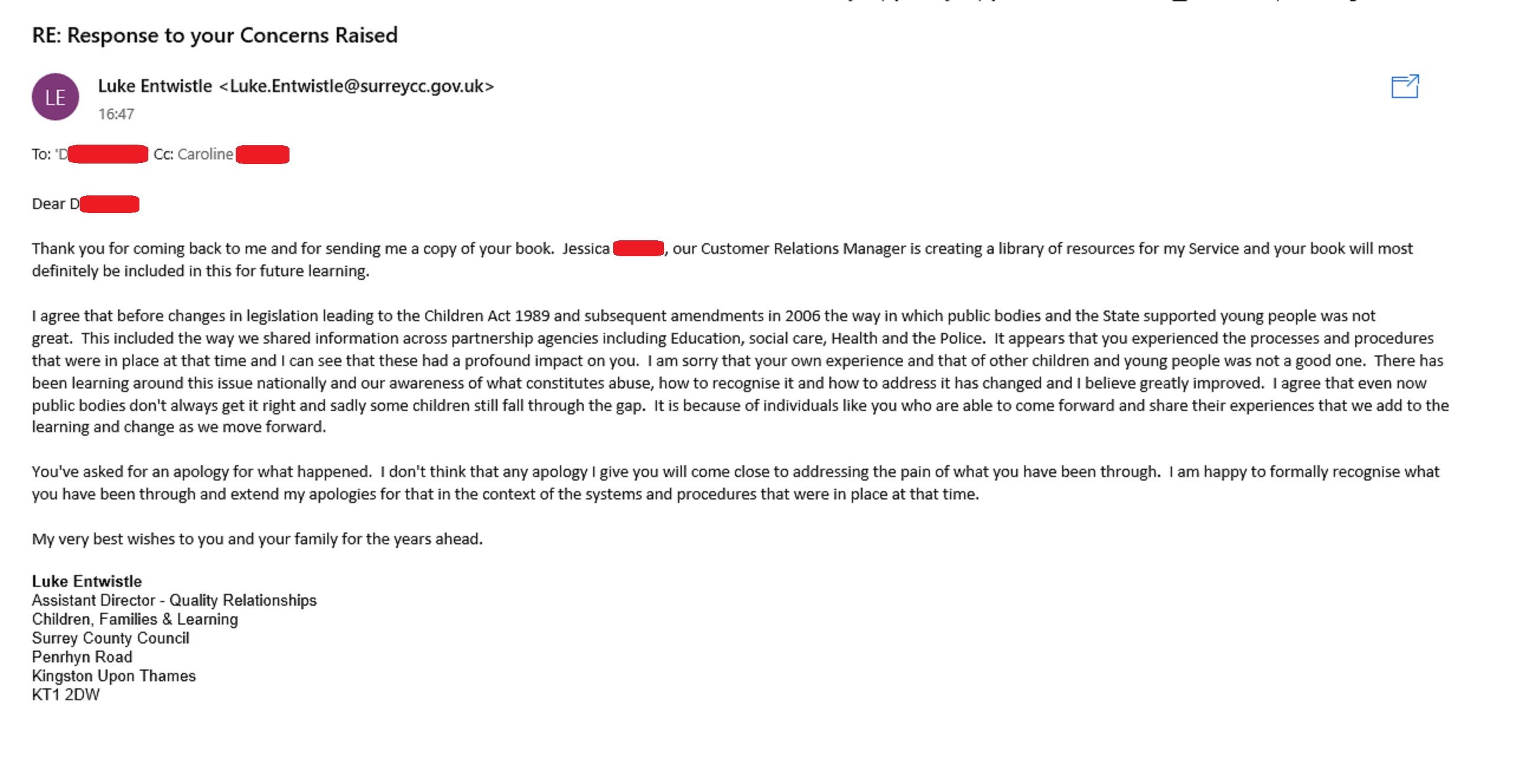 ⚠️ Important note for readers: Everyone’s case is different. Emotional stress, school policies, and child protection systems vary widely. Always seek professional legal or therapeutic advice before taking any action in a child protection matter.I spent £50k moving house for this. The school heads (Danny Maloney's) pre school speech was just a sales pitch full of hot air and fake smiles and he had the cheek to write to me stating 'I'm not quite sure what I would be apologising for." See the correspondents in the last chapter of my book.